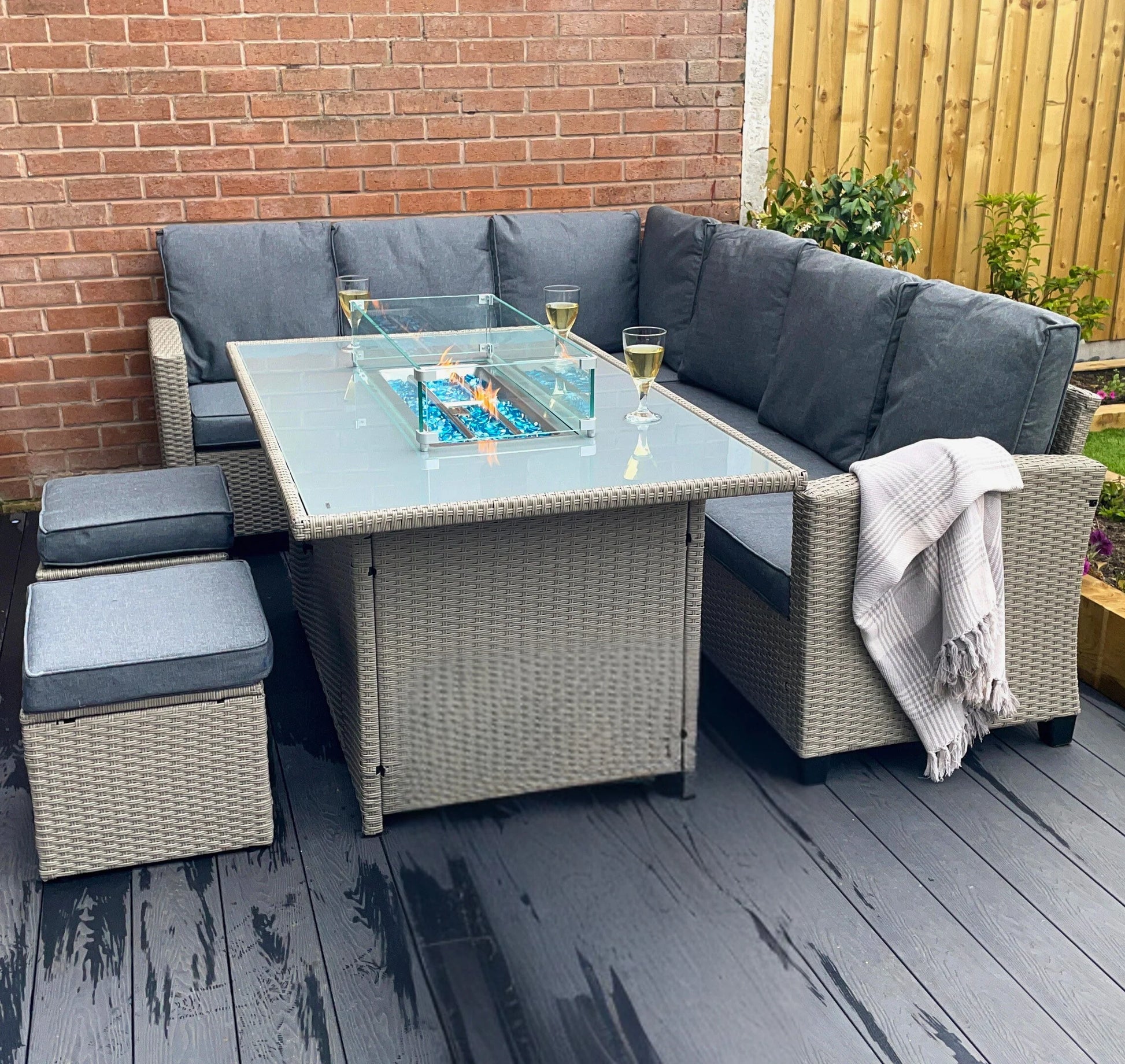 Gather your friends and family around the cosy fire pit table, as you relax in the plush cushions of the spacious corner sofa. With enough seating for eight people, this set is ideal for hosting memorable gatherings or simply enjoying quality time outdoors.
